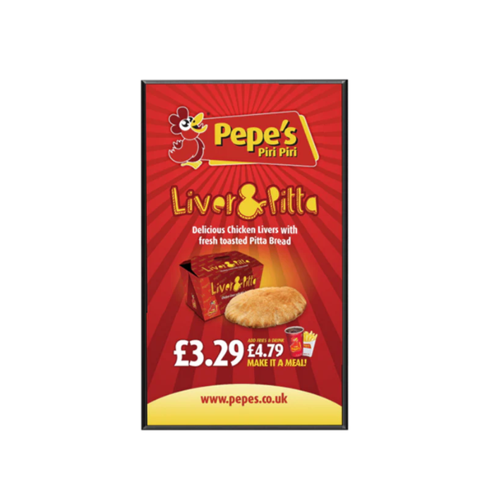 A very dynamic, eye-catching, ultra high brightness(3500 cd/m2) 49" digital menu perfect for your restaurant window. Tempt passersby with this very special digital menu solution with promotions and special offers guaranteed to grab their attention.